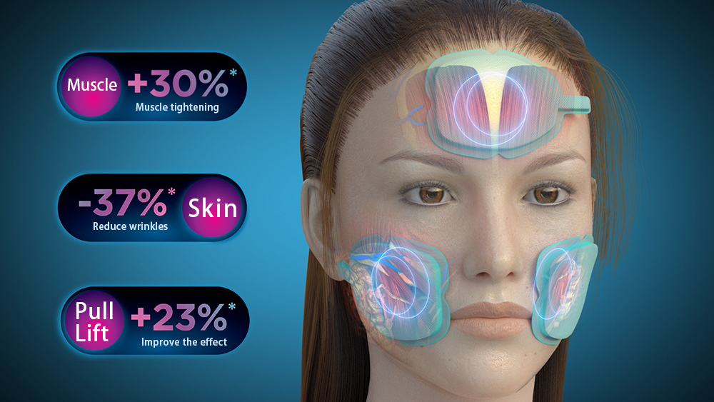 The simultaneous use of two powerful patented technologies, namely, heat energy and high pulse, can tighten the skin, reduce wrinkles, improve the face, turn back the time and make the face look young